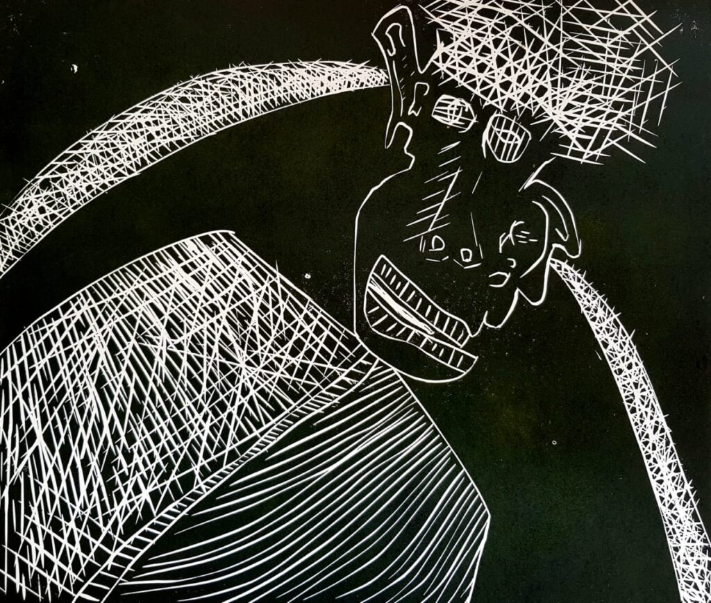 მასალა: უნიკალური ლინოგრავიურა, ქაღალდი. ნამუშევრის ზომა: 21.5 x 16.5 სმ. ფასი: 950 ლარი.