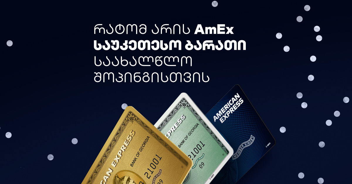 საქართველოს ბანკის AMEX ბარათთან ერთად შენი საახალწლო შოპინგი უფრო კომფორტული და ხელმისაწვდომი გახდება. ასე რომ, ეცადე საყიდლების სია ფასდაკლებების კალენდარს მოარგო.