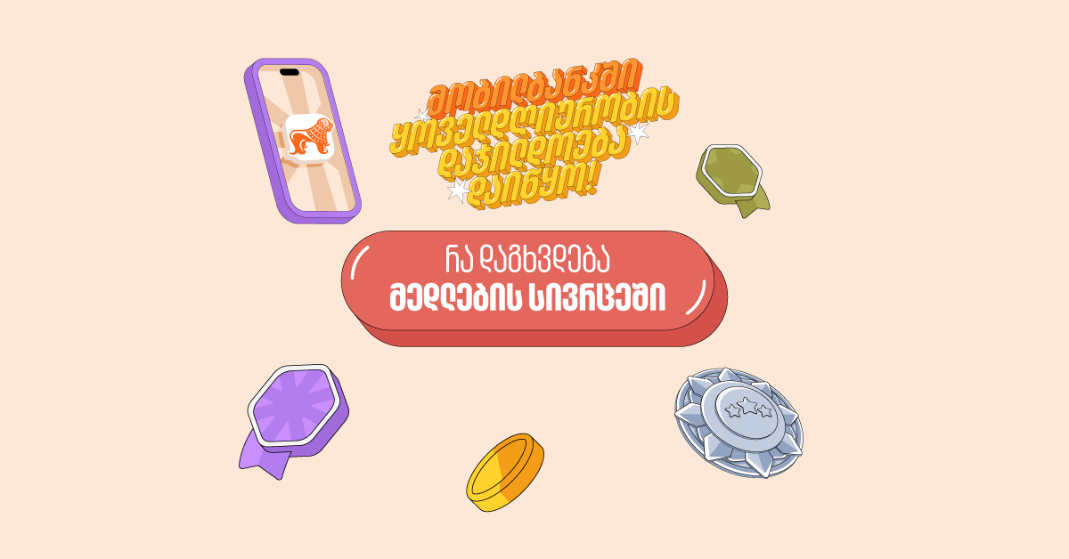 მობილბანკის ახალ სივრცეში უკვე გელოდება მედლები. თითოეული მედალი შეიძლება ერთ ან რამდენიმე აქტივობას აერთიანებდეს. როცა ამ აქტივობებს ასრულებ, ჯილდოვდები მედლით და შესაბამისი საჩუქრით, რომელიც სხვადასხვა სახის შეიძლება იყოს.