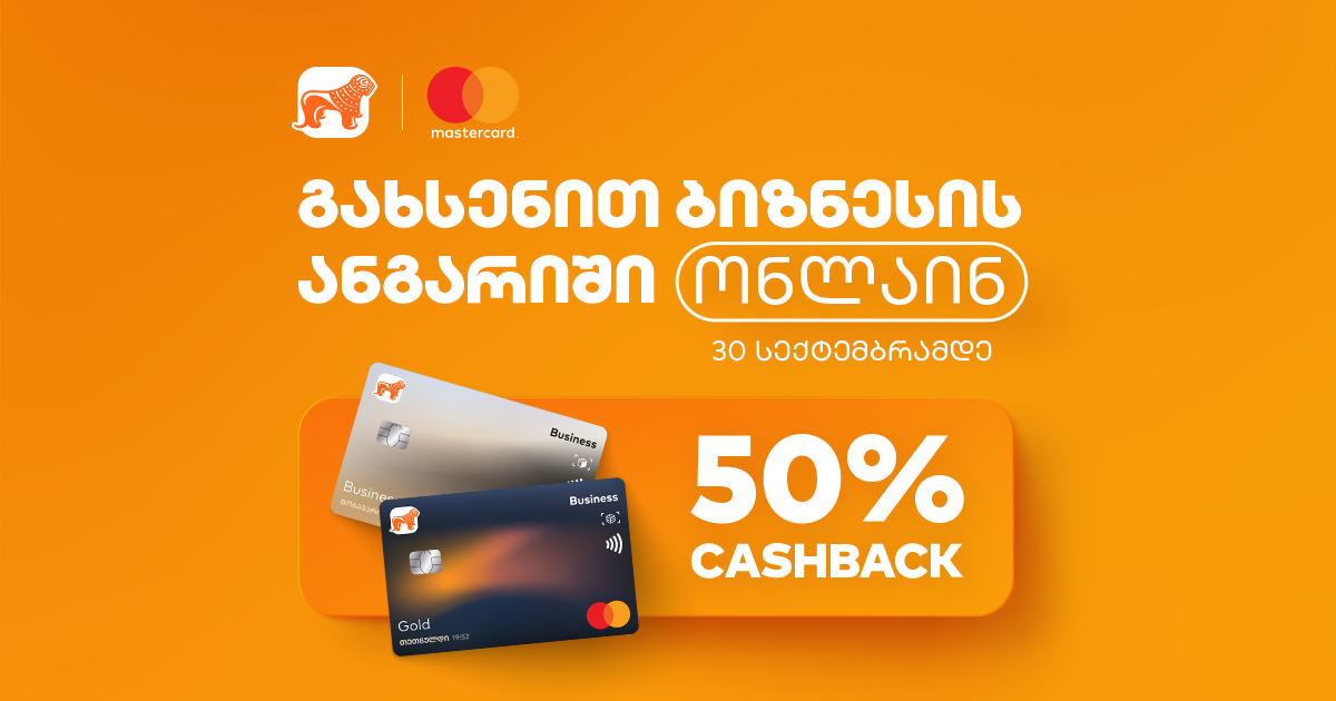 საქართველოს ბანკის ბიზნეს მომხმარებლებს კომფორტულ და ინდივიდუალურ საჭიროებებზე მორგებულ მომსახურებასთან ერთად მრავალფეროვანი შეთავაზებებით სარგებლობაც შეუძლიათ. თუ 30 სექტემბრის ჩათვლით საქართველოს ბანკში პირველ ბიზნეს ანგარიშს გახსნით და Mastercard-ის ბიზნეს ბარათს აიღებთ, ანგარიშის გახსნიდან ერთი თვის განმავლობაში ანგარიშიდან ნებისმიერ ვალუტაში ონლაინ შესრულებული გადახდისას დახარჯული თანხის 50% (მაქსიმუმ 500 ლარი) უკან დაგიბრუნდებათ.